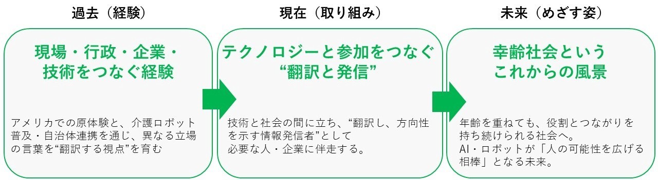 私は、技術と現場、行政と地域、企業と生活者の間にある「ギャップ」をやわらかくつなぎ、幸齢社会をともに拓いていきます。