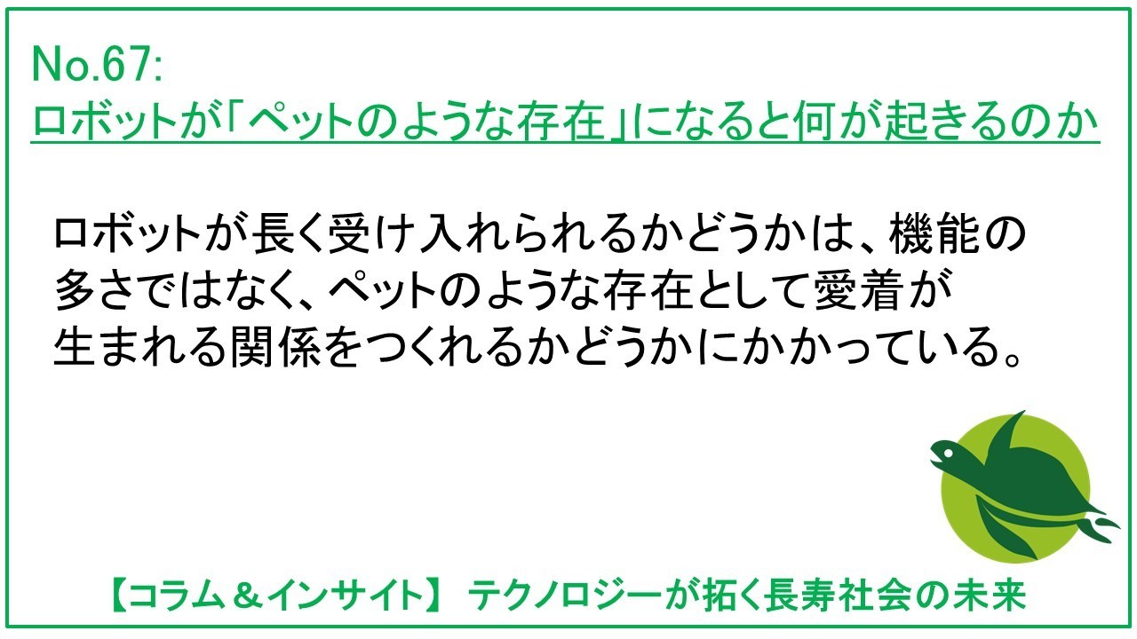 特に、人と関わり、世話をし、愛着を持つような技術は、高齢者にとって「使うもの」ではなく、役割や出番を取り戻すきっかけになり得ます。